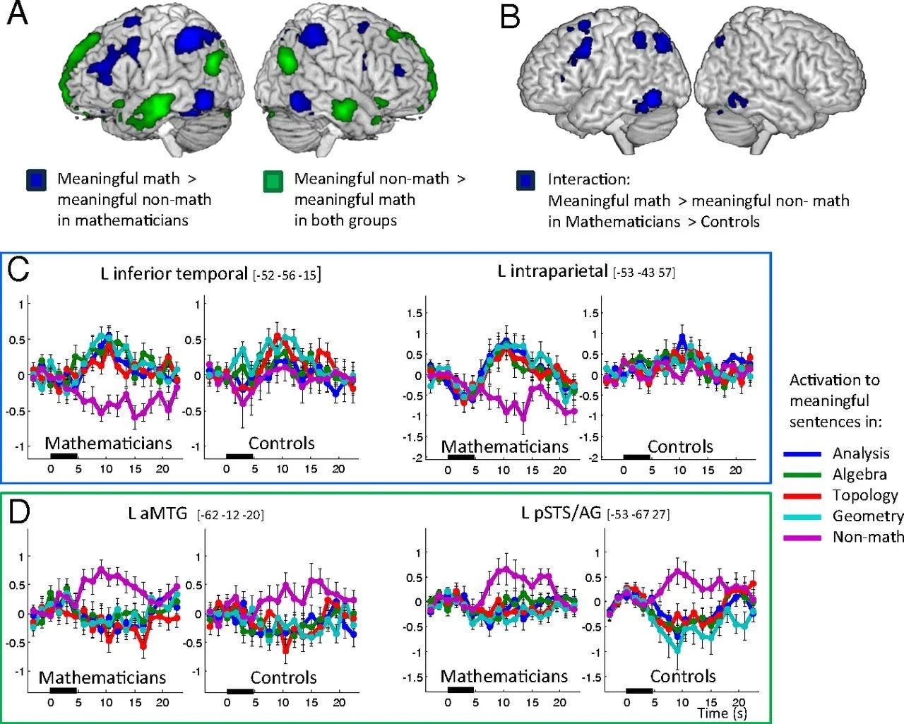 Some existing empirical evidence is directionally aligned with the conjecture. In a fascinating 2016 fMRI study, Marie Amalric and Stanislas Dehaene observed that professional mathematicians process complex mathematical statements by recruiting brain areas that aren’t typically mobilized in language processing, specifically in the inferior temporal and parietal regions. This happens regardless of whether the statements belong to their specific domain of research. By contrast, the control population of non-mathematicians with equal academic standing activate the expected language-processing regions when exposed to the same mathematical statements.