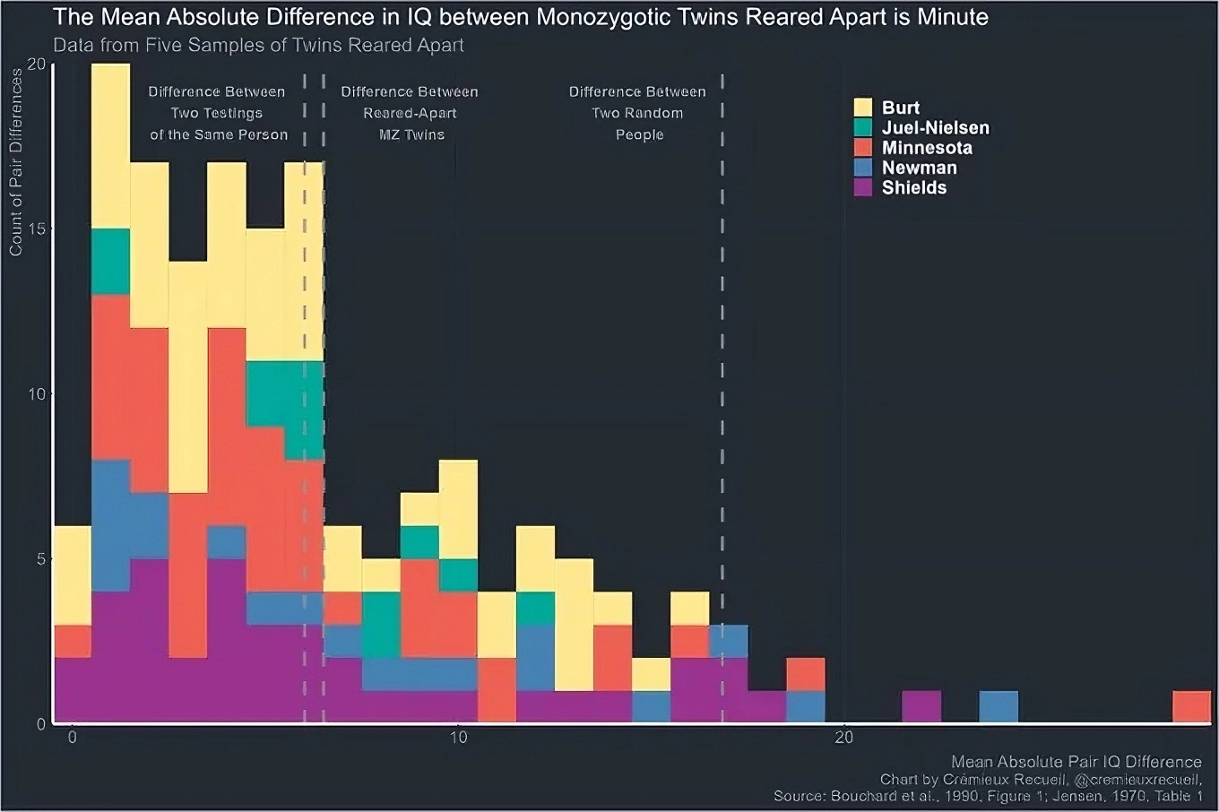 I agree that there is something irresistible in the idea of studying identical twins reared apart. It feels like a “natural experiment” that would magically tell nature and nurture apart. In fact, this appearance of simplicity, of being “cutting and definite”, is precisely what made Cremieux’s visual so compelling and viral.