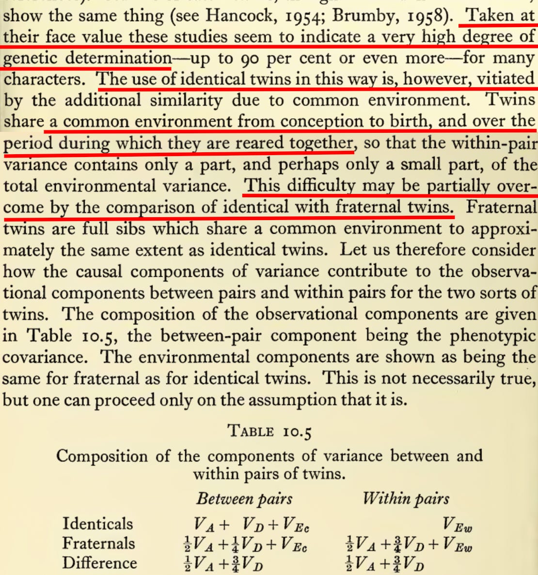 It is impossible that Bouchard, publishing in 1990, could have ignored any of this. The entire discussion—from the imperious need to correct for biases to the standard methodology for doing so—was fully laid out in Douglas Scott Falconer’s seminal book, Introduction to quantitative genetics, whose first edition was published in 1960: