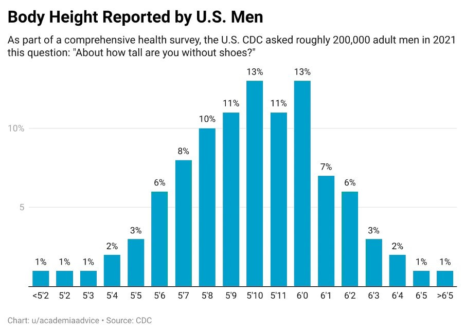 In fact, the self-reported body height of US men would fit a near-perfect Gaussian if it wasn’t for the cheaters claiming to be 6’, when they’re only 5’11.
