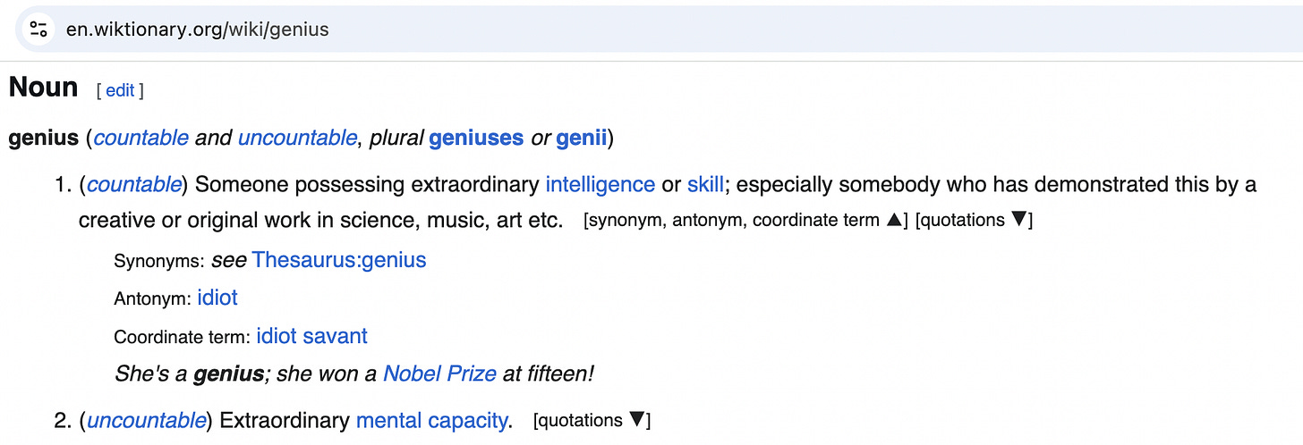 Wiktionary defines talent as “marked natural ability skill.” When this marked ability becomes extraordinary, we enter the territory of genius: